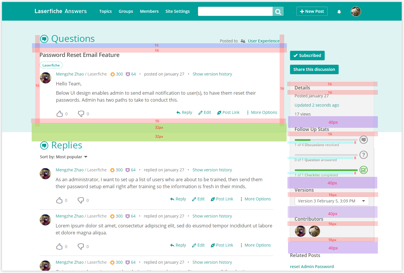 Laserfiche Discussions began when we saw there was a need for a social community platform where our customers can ask questions and share solutions. This platform gives users the ability to collaborate with the right audience and subscribe to relevant topics. The application also integrates with other Laserfiche products by allowing storage of posts into the Laserfiche repository and providing a platform for discussions regarding a document. It began as a simple Q&A site exclusively for Laserfiche, but over the years, expanded into a product that enhanced the experience of Laserfiche software for our clients.